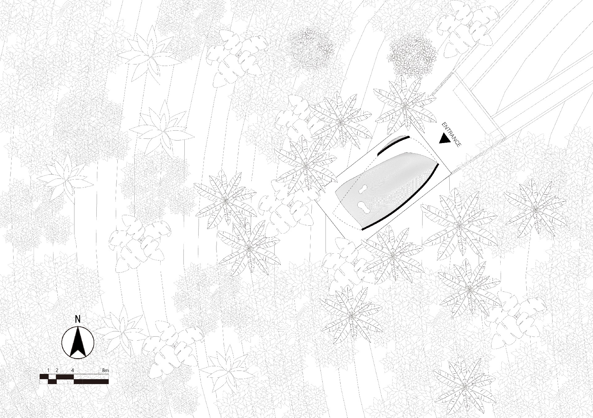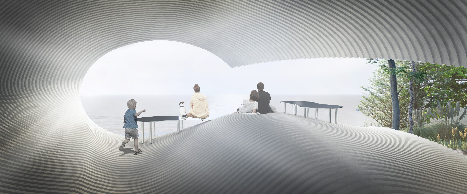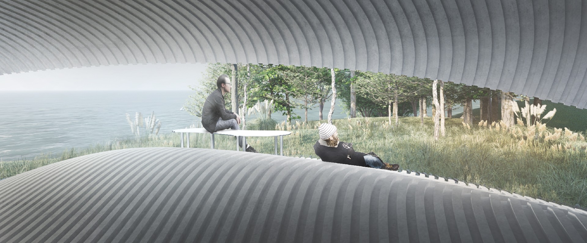 本方案以“海浪”为意向,来回应场地与主题。如何让人在空间中遇见山、海、天空、森林、风、光、鸟鸣等自然风景,如何通过空间带给人从未有过的自然体验,如何让陌生的人们在这独一无二的风景中相遇,是本案思考的核心问题。