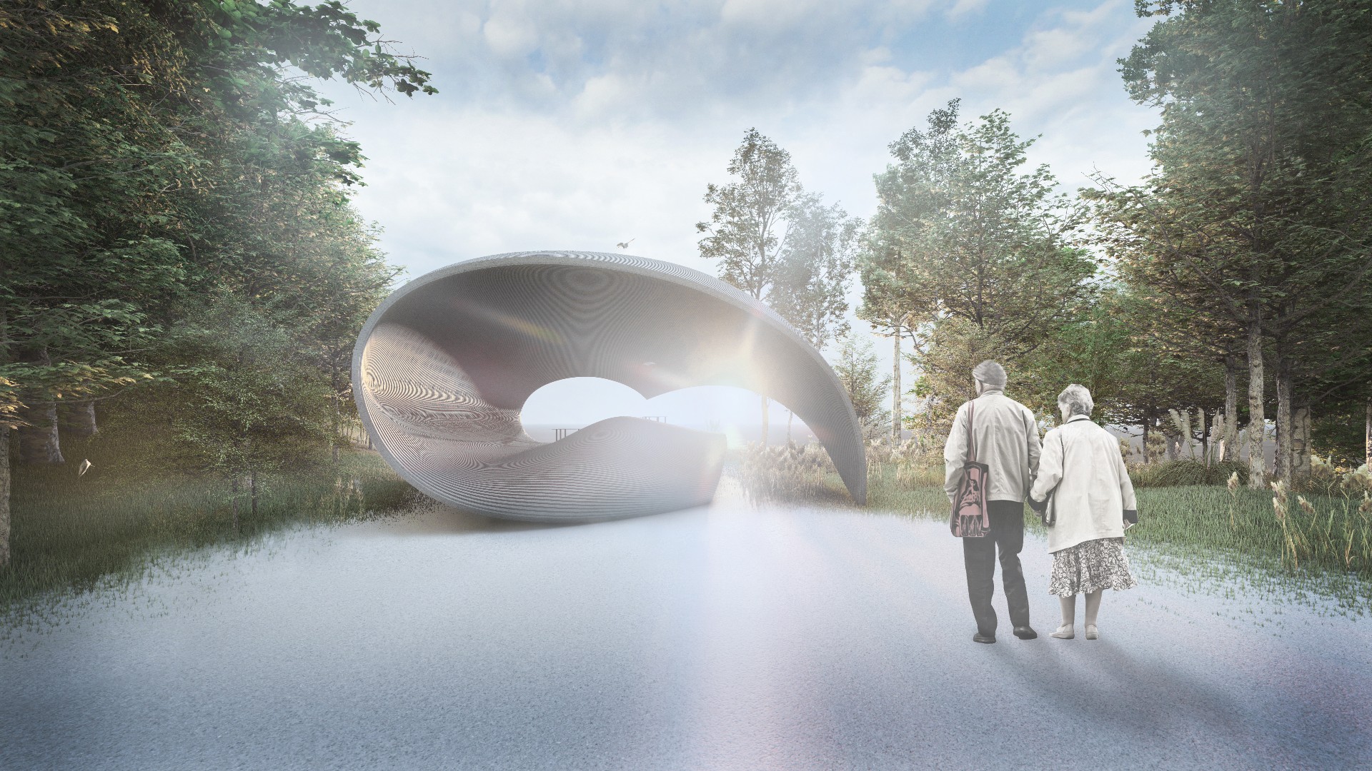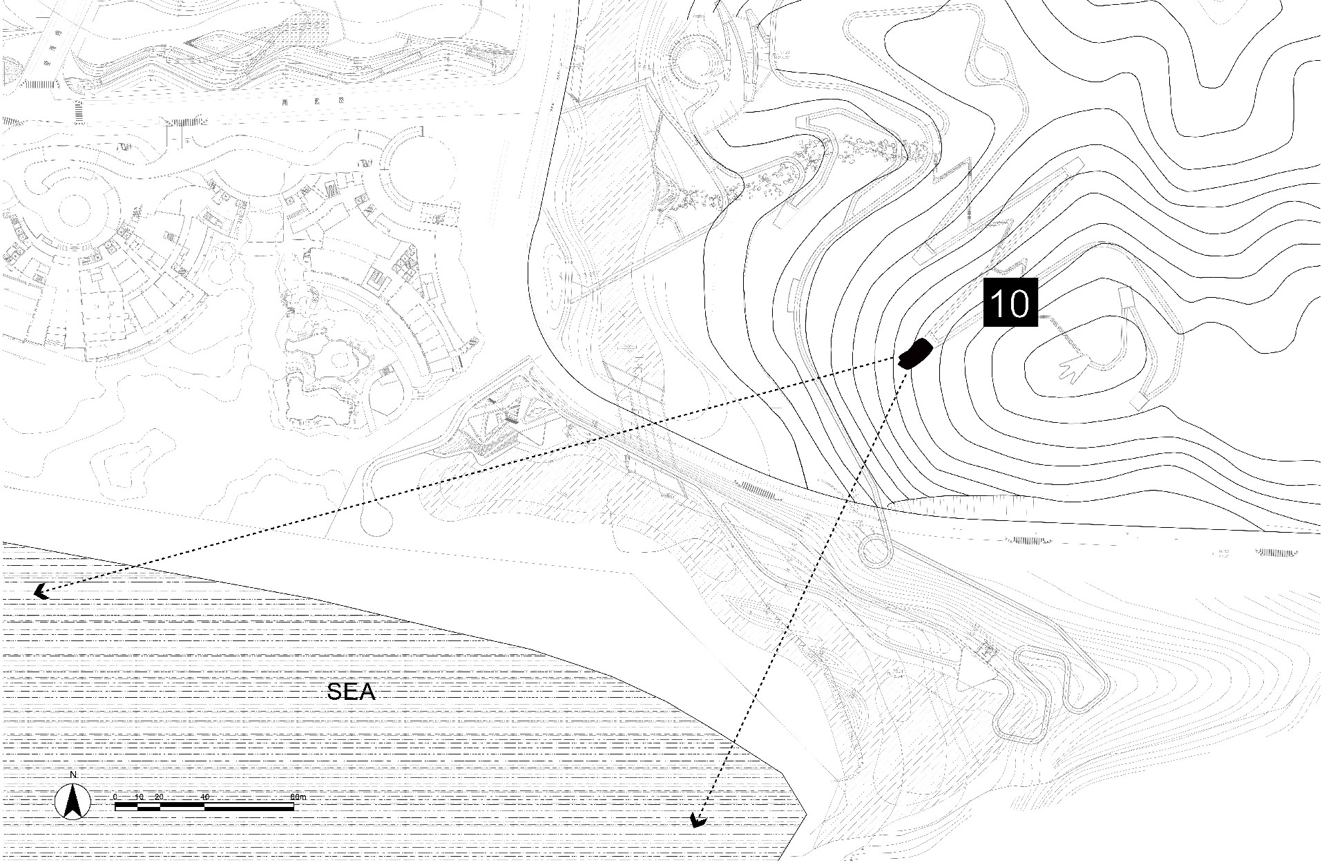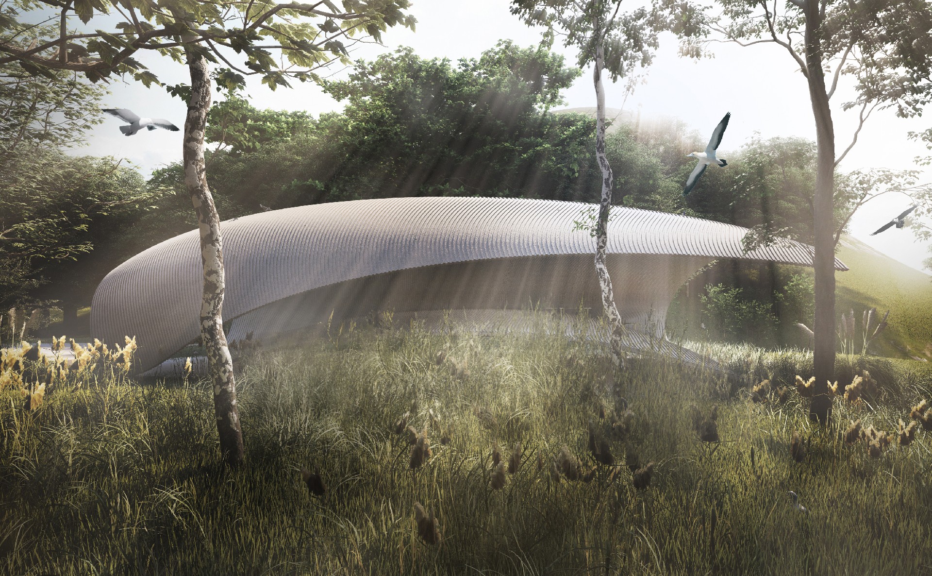 本方案以“海浪”为意向,来回应场地与主题。如何让人在空间中遇见山、海、天空、森林、风、光、鸟鸣等自然风景,如何通过空间带给人从未有过的自然体验,如何让陌生的人们在这独一无二的风景中相遇,是本案思考的核心问题。