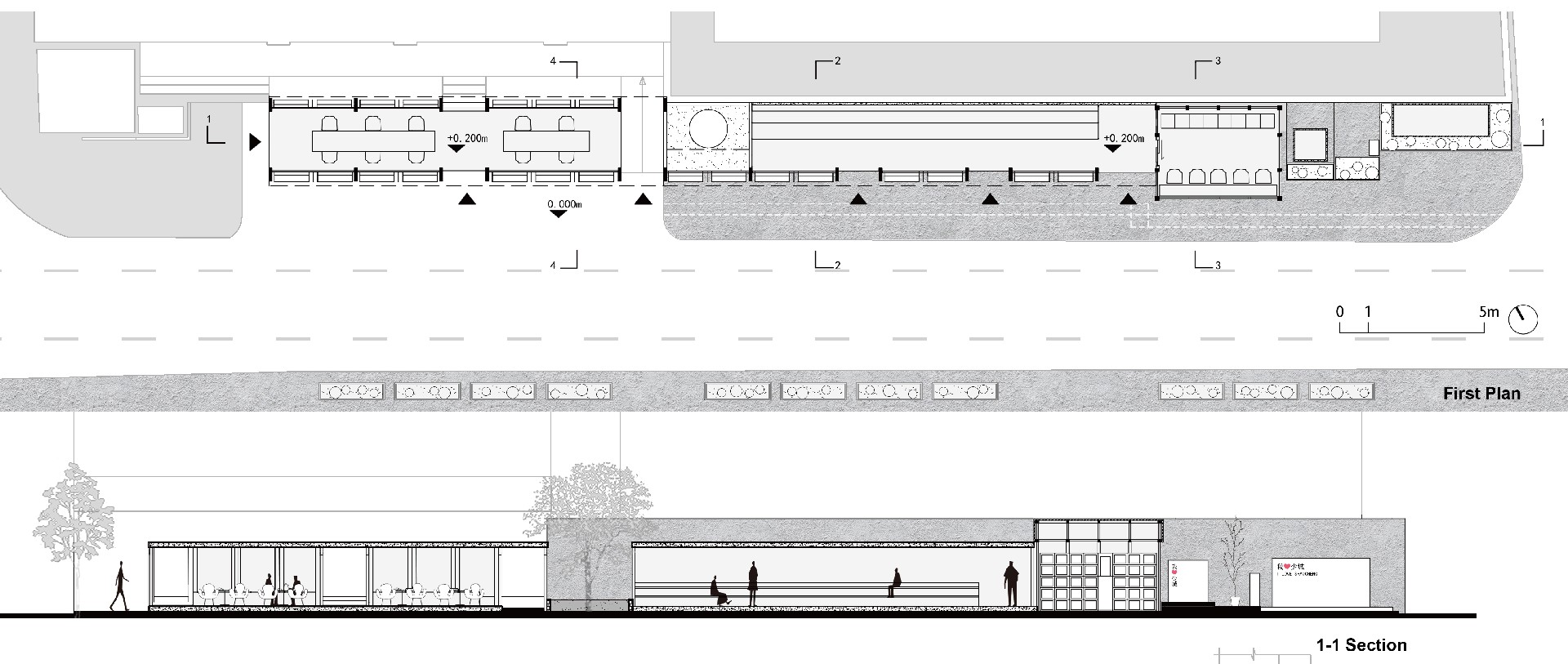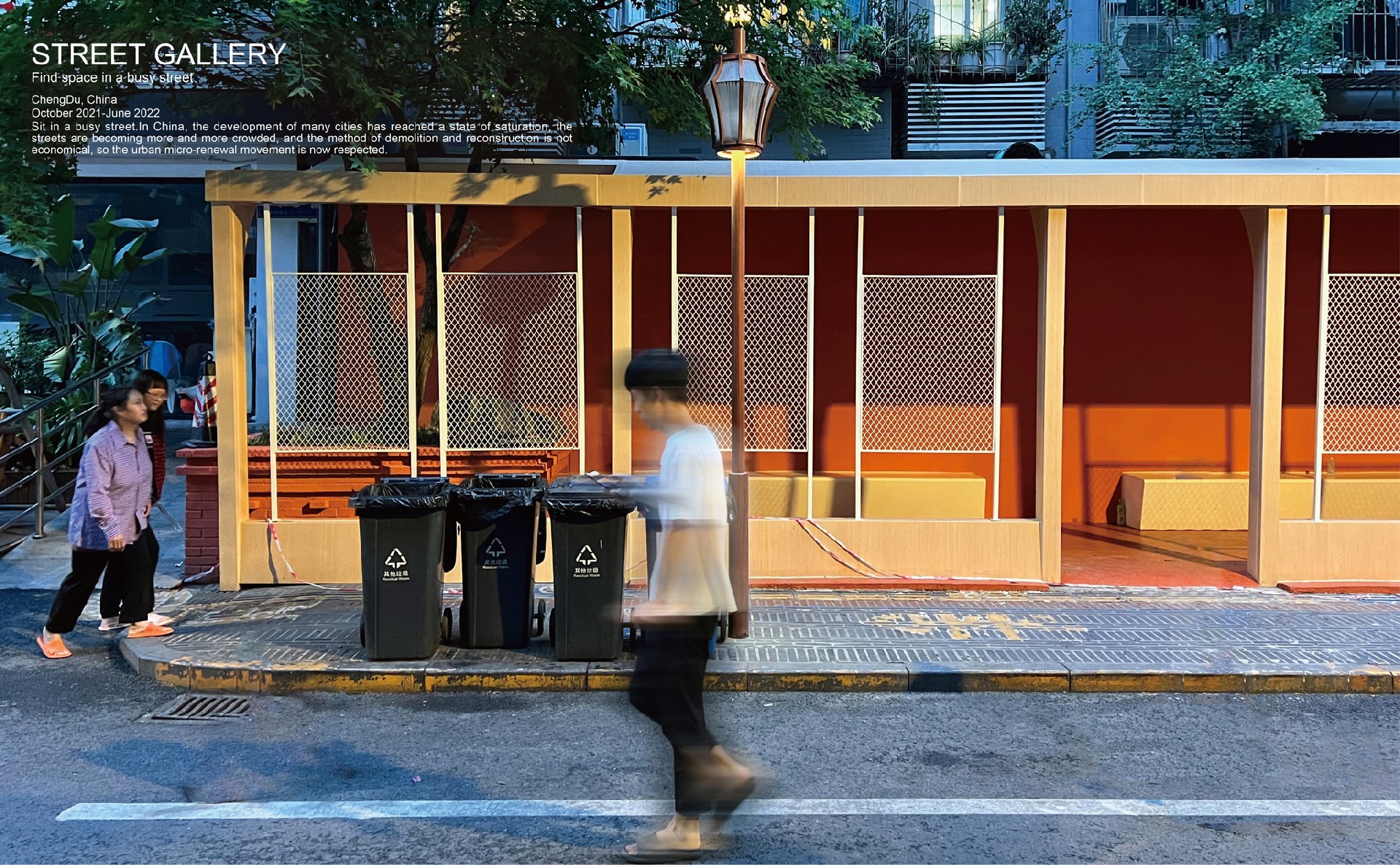 项目是少城城事更新国际竞赛第一名、四川省第二批城乡社区治理试点项目入选的获奖作品,定位是社区策展和交流空间。场地是与人行道并行的线性场地,尽管原来也有设置一些座椅。但由于它和马路,以及人行道并行,使得它是一个通过型的交通空间,所以人无法安心坐下,进行一些休息和交往活动,最终导致了吸引力小,使用率低。