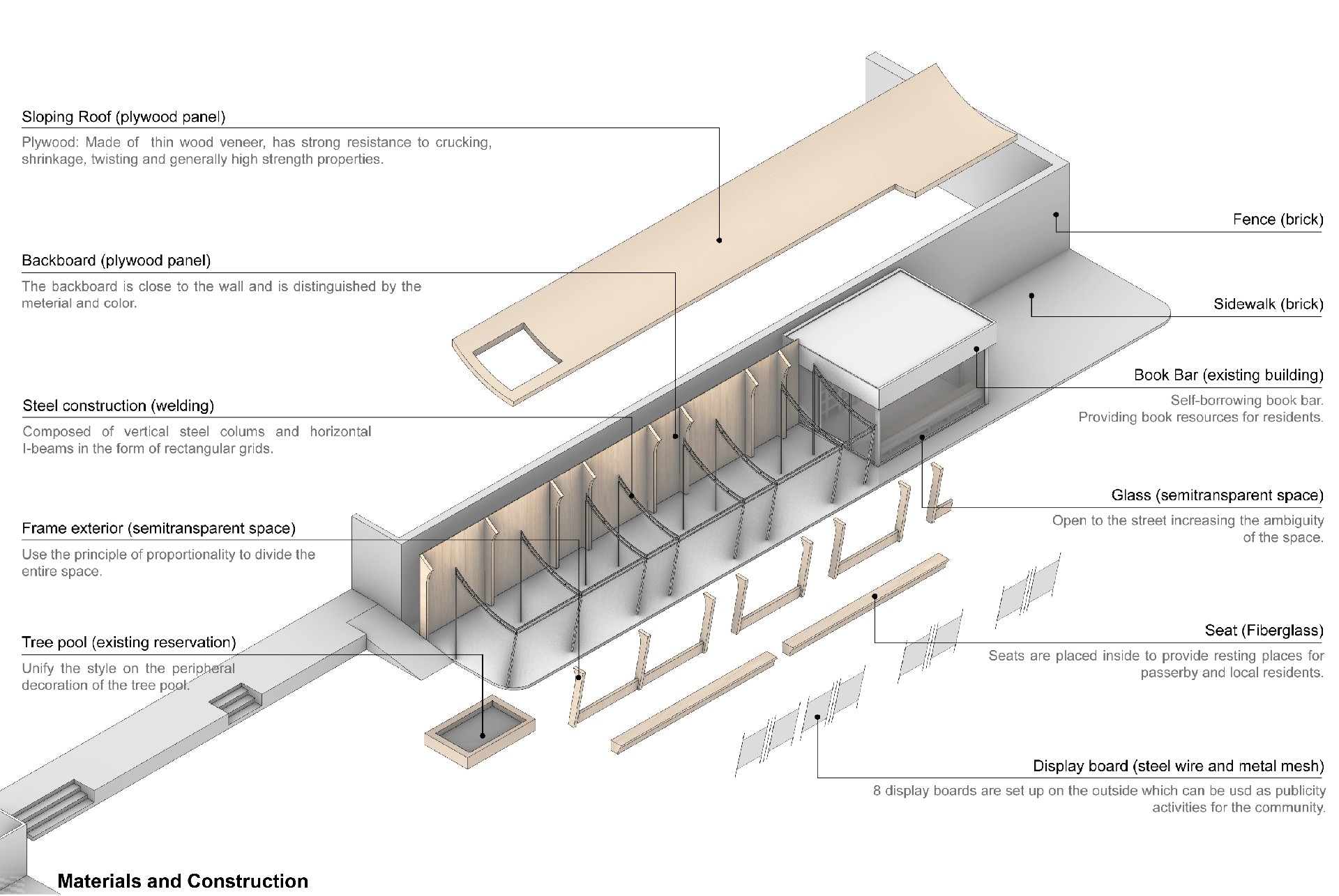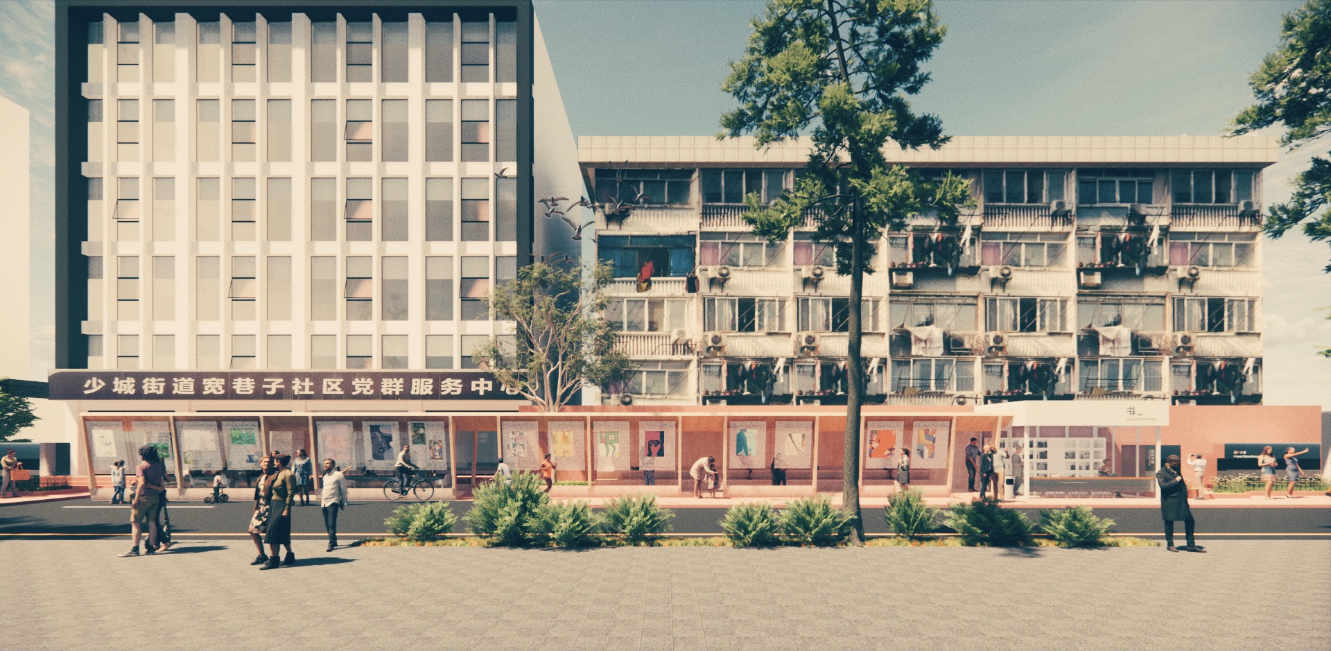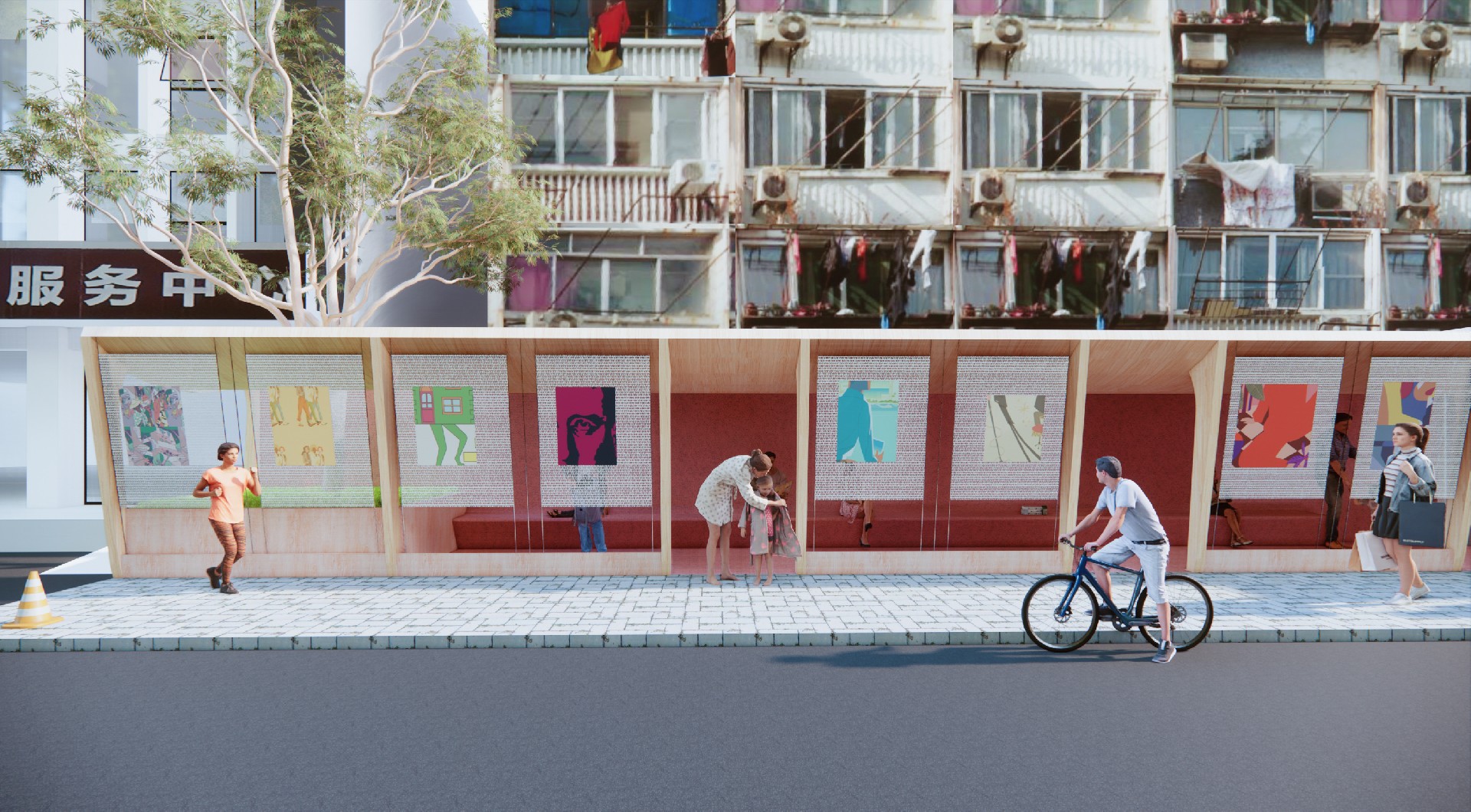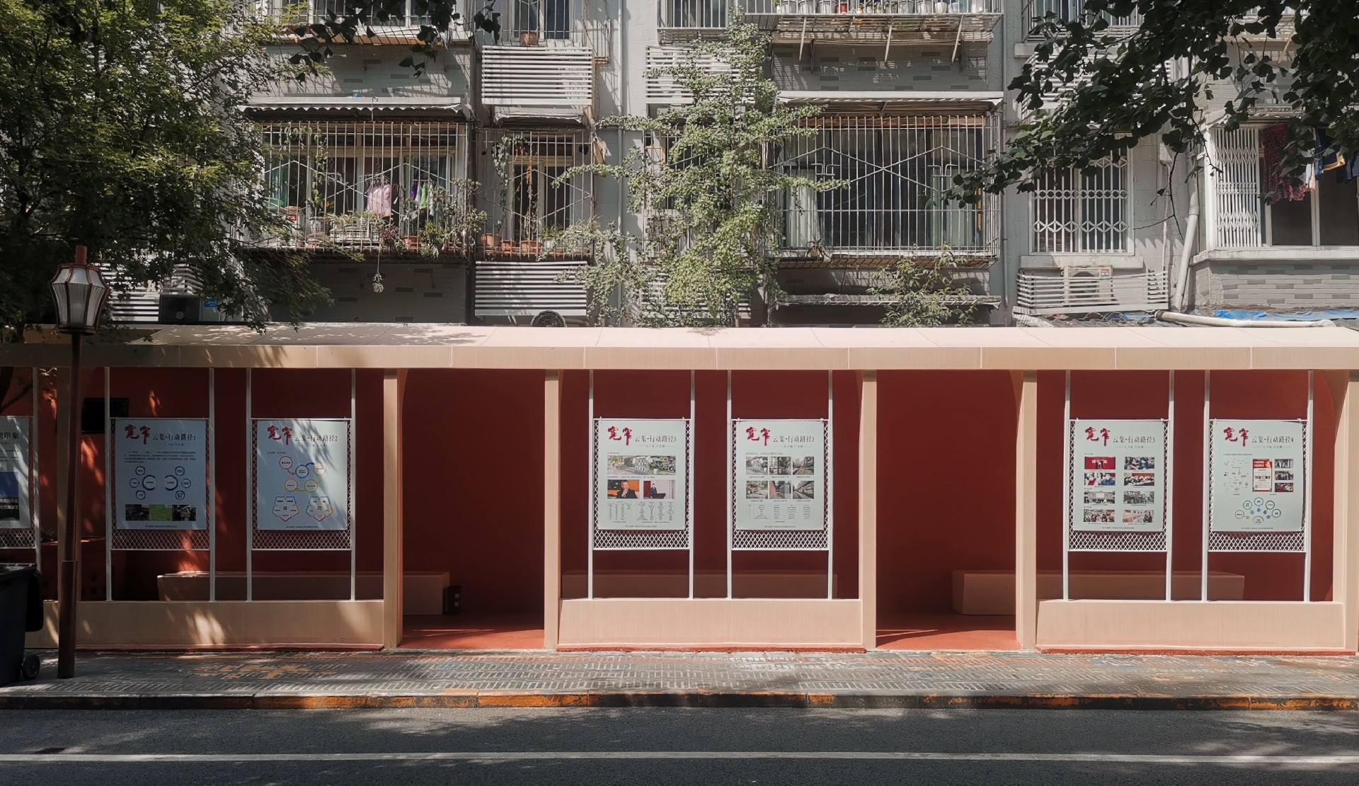 与原本完全开放露天的空间对比,我们设置的廊子在这里连接了书屋、服务中心和街道,能带来适当的空间限定,划分出停留场所的同时,保证了与街道的联系性。在这不安定的场地中创造了相对安定但又开放的空间。廊子的结构之间采用金属网作为社区展示的展墙,海报、通告、艺术作品都能方便的挂上去展示并更换,金属网形成的半透明状态保证了空间开放性。最终创造一个居民愿意停留,并在这里发生交流的公共空间。