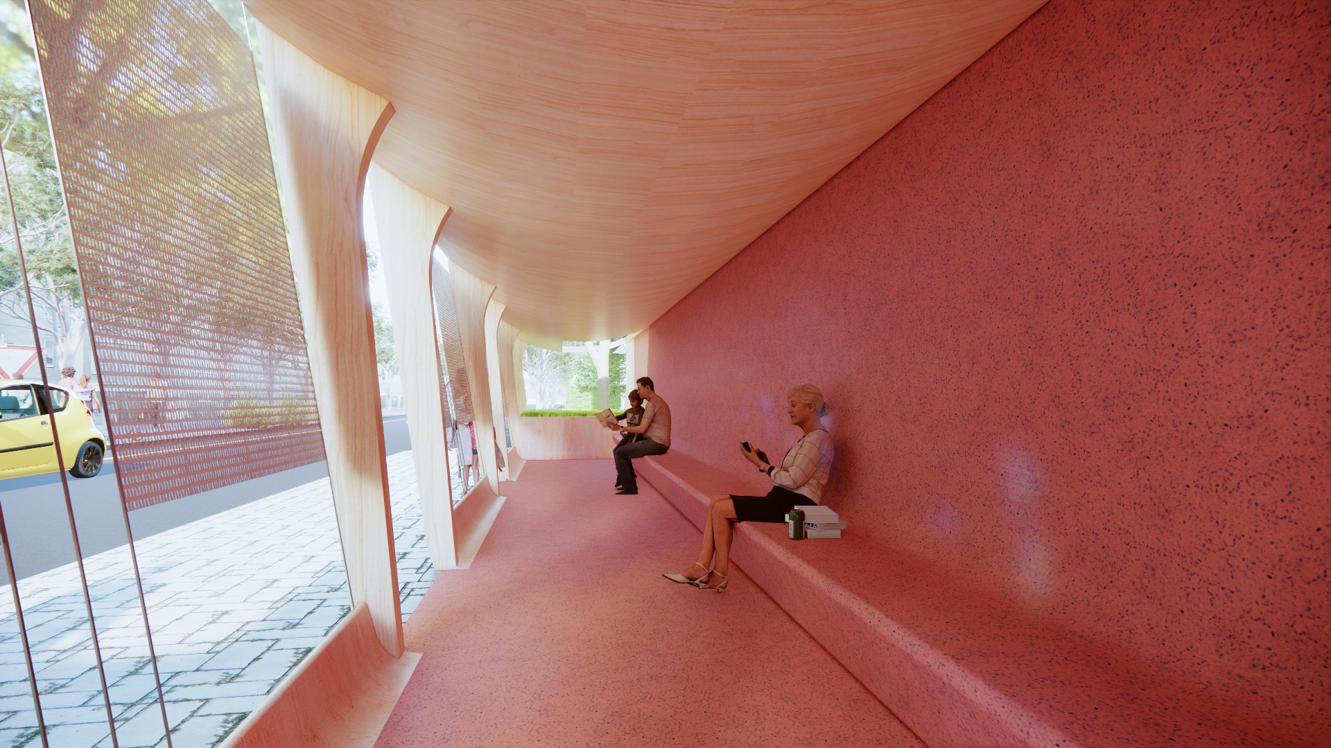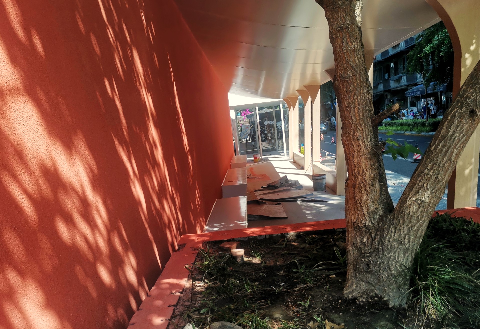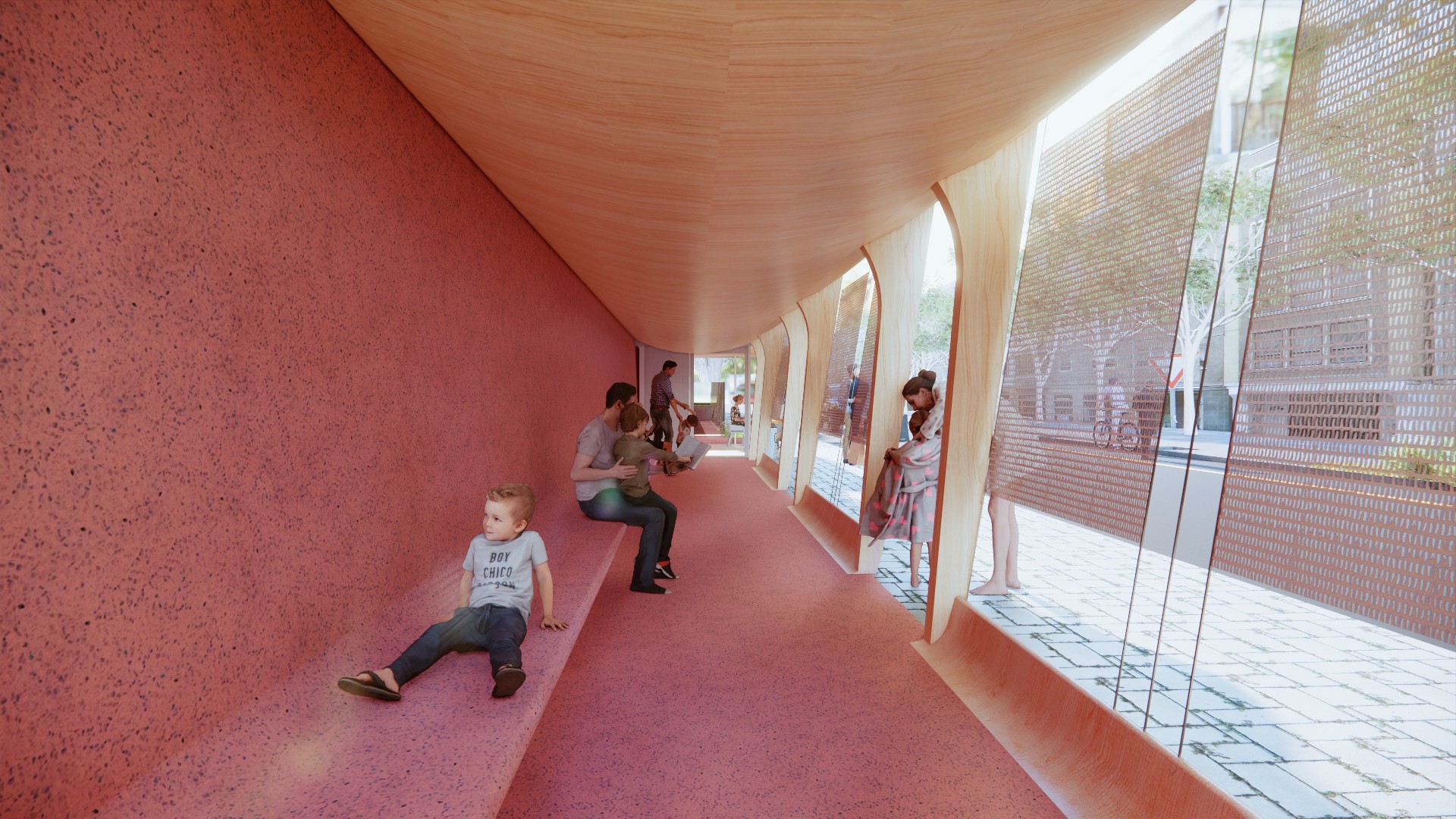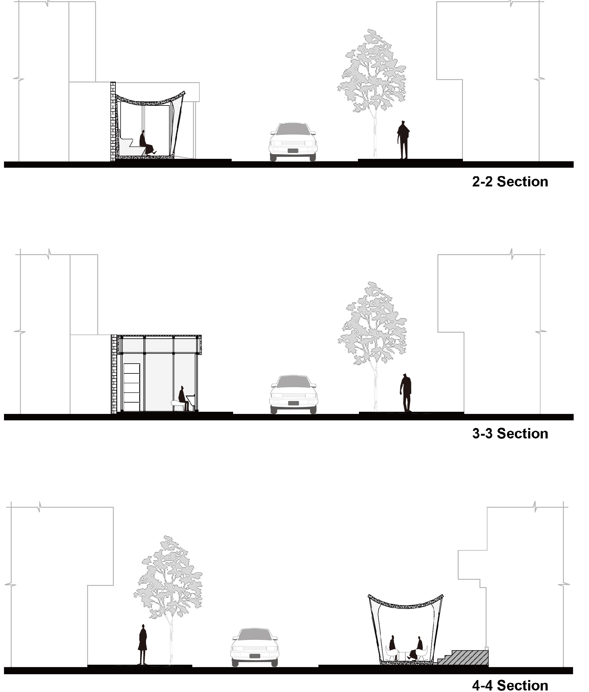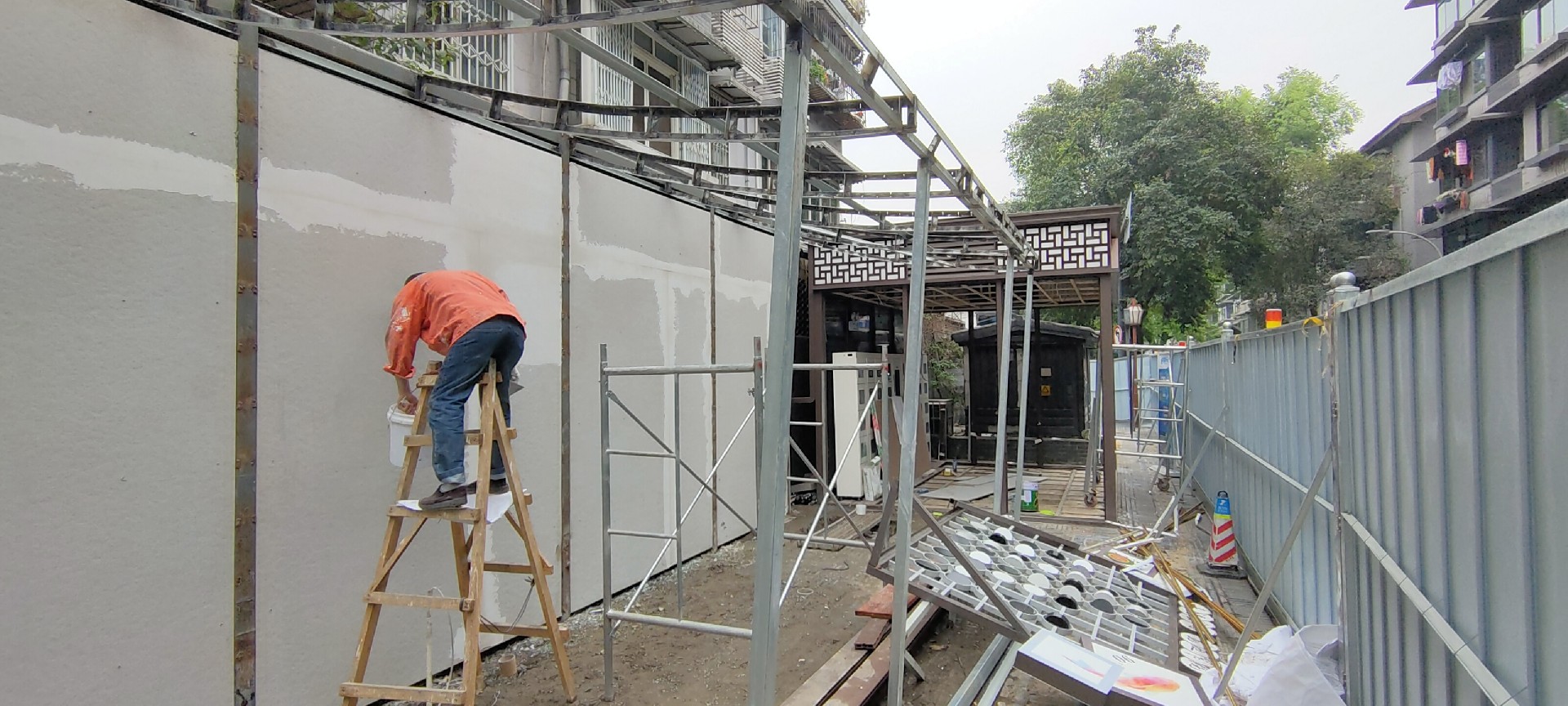 与原本完全开放露天的空间对比,我们设置的廊子在这里连接了书屋、服务中心和街道,能带来适当的空间限定,划分出停留场所的同时,保证了与街道的联系性。在这不安定的场地中创造了相对安定但又开放的空间。廊子的结构之间采用金属网作为社区展示的展墙,海报、通告、艺术作品都能方便的挂上去展示并更换,金属网形成的半透明状态保证了空间开放性。最终创造一个居民愿意停留,并在这里发生交流的公共空间。